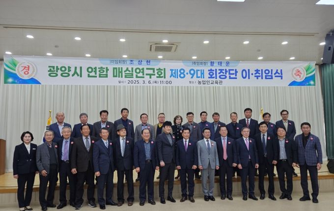 (아름다운교육신문) 광양시연합매실연구회는 지난 6일 광양시농업기술센터 농업인교육관 2층에서 2019년부터 6년간 연구회를 이끌며 광양매실 산업발전에 기여해온 제8대 조상현 회장의 이임식과 함께 제9대 황태운 회장의 취임식을 가졌다고 7일 밝혔다.