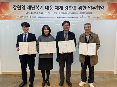 (아름다운교육신문) 강원특별자치도사회서비스원은 3월 7일 오전 11시, 사회복지협의회, 사회복지사협회, 더프라미스와 함께 「강원형 재난복지 대응 체계 강화」를 위한 업무협약을 체결했다고 밝혔다.