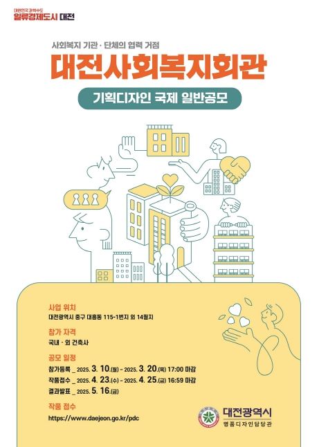 이장우 대전시장은 “공공건축은 도시의 얼굴이자, 시민의 삶의 질을 결정하는 핵심 요소”라며 “기획 디자인 공모를 통해 대전사회복지회관이 지역 복지 네트워크의 중심으로 자리잡고, 나아가 원도심 활성화의 새로운 모델이 될 수 있도록 유능한 국내·외 건축가의 창의적인 설계안을 기대한다”라고 말했다.