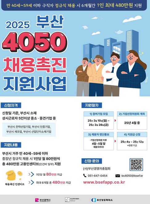 (아름다운교육신문) 부산시는 '2025 부산 4050 채용촉진 지원사업'에 참여할 기업을 오늘(10일)부터 3월 28일까지 모집한다고 밝혔다.
