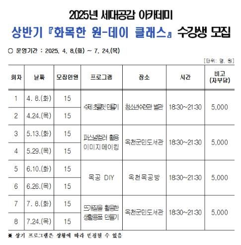 상반기 수강생은 3. 11. 부터 3. 24.까지 모집하며, 옥천군민 누구나 참여 가능하다.