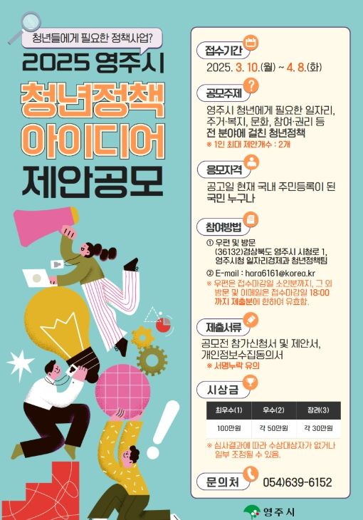 (아름다운교육신문) 영주시가 지역 맞춤형 청년정책 발굴을 위해 오는 4월 8일까지 ‘2025년 청년정책 아이디어 제안 공모전’을 실시한다고 밝혔다.