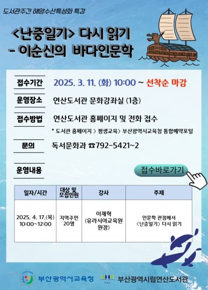 (아름다운교육신문) 부산광역시립연산도서관은 4월 도서관 주간을 맞아 4월 17일 오전 10시 연산도서관 문화강좌실에서 지역주민 20명을 대상으로 해양수산 특성화 특강 ‘난중일기 다시읽기-이순신의 바다인문학’을 진행한다.