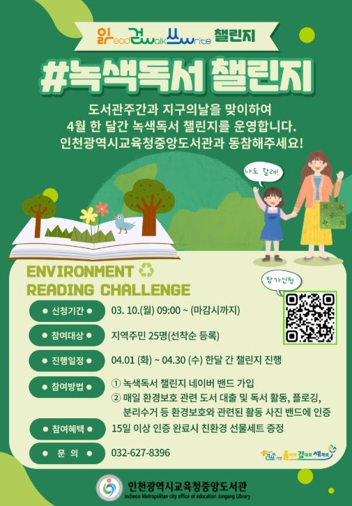 이번 챌린지는 환경 보호와 독서를 연계한 프로그램으로, 인천 지역 주민이라면 누구나 참여할 수 있으며, 참가자들은 ‘녹색 독서 챌린지’ 네이버 밴드에 가입 후 환경 관련 독서, 플로깅 활동, 분리수거 실천 등 다양한 환경 보호 활동을 인증하면 된다.