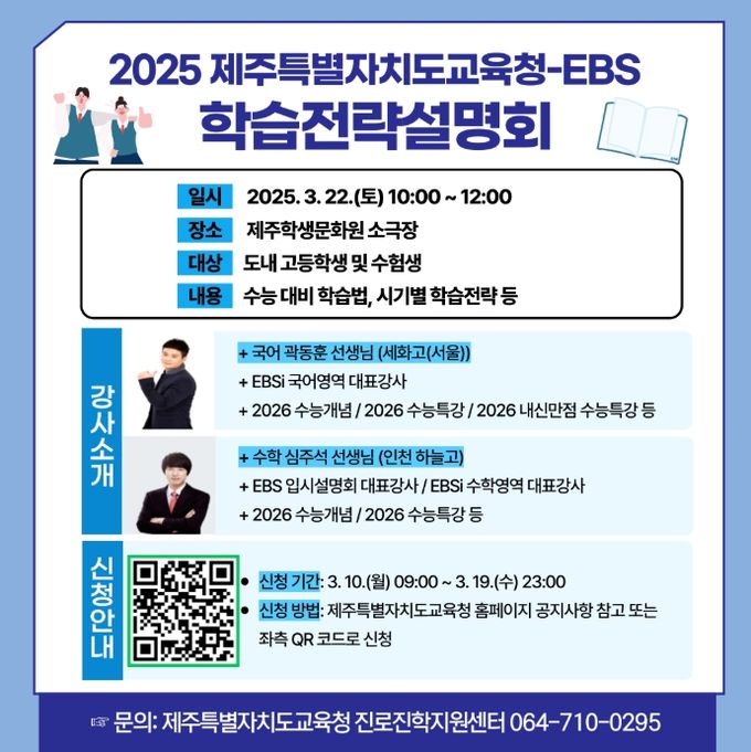 (아름다운교육신문) 제주특별자치도교육청은 오는 22일 오전 10시부터 제주학생문화원 1층 소극장에서 2025 제주특별자치도교육청-EBS 학습전략설명회를 개최한다고 밝혔다.