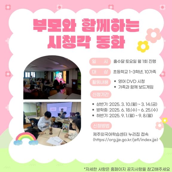 부모와 함께하는 시청각동화는 초등학생 1~3학년과 보호자를 대상으로 영어 동화 시청 및 놀이 활동을 통해 듣고, 즐기고 함께하는 가족놀이시간으로 진행될 예정이다.
