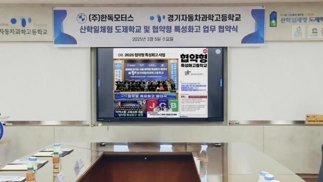 (아름다운교육신문) 경기자동차과학고등학교와 (주)한독모터스는 2025년 3월 5일 11시 대외협력실에서 ‘산학일체형도제학교 및 협약형 특성화고 산학협력을 위한 업무 협약식’을 개최하고, 자동차 산업을 선도할 우수 기술 인재 양성을 위한 협력을 공식화했다.