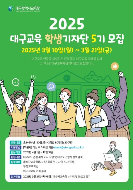 (아름다운교육신문) 대구시교육청은 3월 10일부터 21일까지 2주간 대구교육의 주요 정책과 각종 소식을 생동감 있게 전하고 대구교육의 미래를 함께 그려나갈‘2025년 대구교육기자단’을 모집한다고 밝혔다.