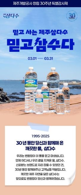 (아름다운교육신문) 제주삼다수를 생산·판매하는 제주특별자치도개발공사가 창립 30주년을 맞아 3월 한 달간 제주삼다수 브랜드 기획전 ‘믿고삼수다’를 진행한다.