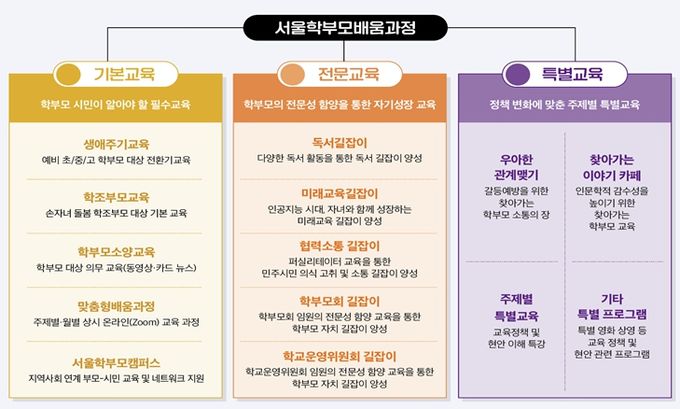 2025 서울학부모배움과정 연수는 학부모들이 자녀의 교육에 대한 이해를 통해 자녀의 학습과 정서적 성장을 효과적으로 지원하고 건강한 학교 참여에 필요한 실질적인 지식과 기술을 습득하는 것을 목표로 한다. 세부 교육과정은 △학부모의 기본 소양을 함양하는 기본교육 △전문성 및 자치역량 강화를 위한 전문교육 △최신 정책변화에 맞춘 주제별 특별교육으로 3월부터 11월까지 추진된다.