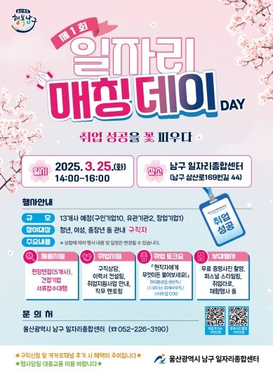 (아름다운교육신문) 울산 남구는 오는 25일 남구 일자리종합센터에서 구인 기업의 채용시기에 맞춘 현장면접과 참여자가 능동적으로 참여할 수 있는 취업 토크쇼와 각종 부대행사 등 다양한 취업지원 콘텐츠로 구성된 남구 대표 채용행사인 ‘제1회 일자리매칭데이’개최를 본격적으로 준비한다고 밝혔다.