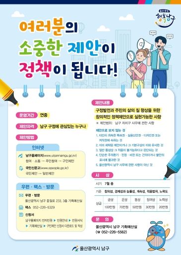 (아름다운교육신문) 울산 남구는 구민을 대상으로 행정제도와 운영의 개선을 목적으로 한 참신하고 다양한 정책 아이디어를 연중 접수한다고 11일 밝혔다.