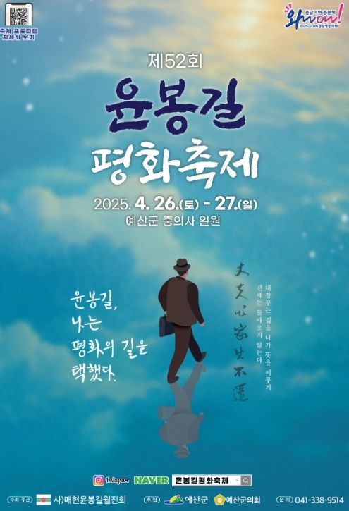 (아름다운교육신문) 예산군은 ‘제52회 윤봉길 평화축제’를 오는 4월 26일부터 27일까지 예산군 덕산면 충의사 도중도 일원에서 개최한다고 밝혔다.