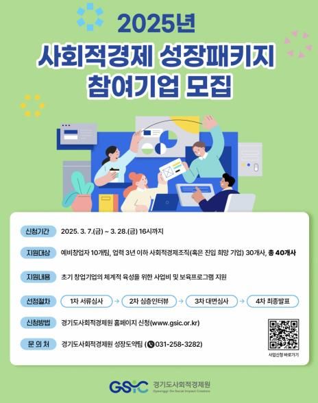 (아름다운교육신문) 경기도사회적경제원이 ‘2025년 사회적경제 성장패키지’ 사업에 참여할 (예비)창업 기업을 오는 28일까지 모집한다.