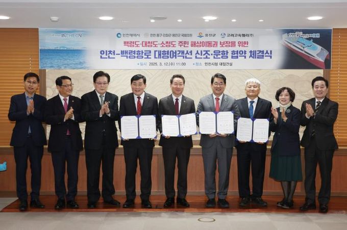 (아름다운교육신문) 옹진군은 12일 고려고속훼리㈜와 인천-백령항로 대형여객선 도입지원을 위한 업무협약을 체결했다고 밝혔다.