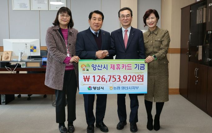 이번에 전달받은 적립 기금은 1억2,675만원으로 양산시와 NH농협의 제휴카드 협약에 따라 적립됐으며, 양산시가 지난 한 해 동안 공무에 이용한 기관카드 및 보조금 전용카드, 소속 공무원이 사용한 복지카드 등의 사용금액의 0.1 ~ 1.0% 를 포인트로 적립해 조성했다.
