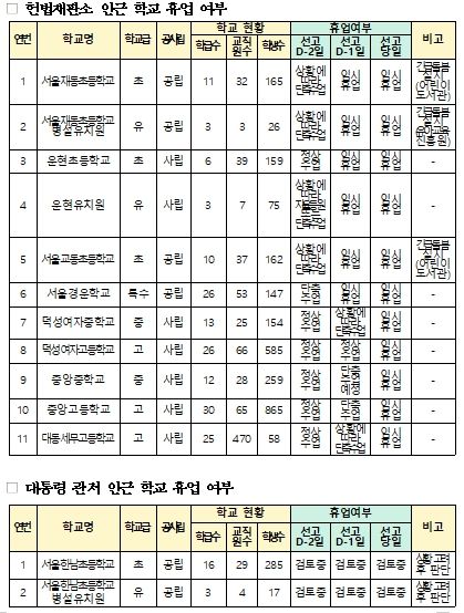 서울특별시교육청은 대통령 탄핵 심판 선고 당일 헌법재판소 부근에 대규모 집회·시위 군중이 운집이 예상됨에 따라 학생 안전사고 예방을 위해 인근 유·초·중·고·특수 등 11개교 임시휴업을 실시한다고 밝혔다.