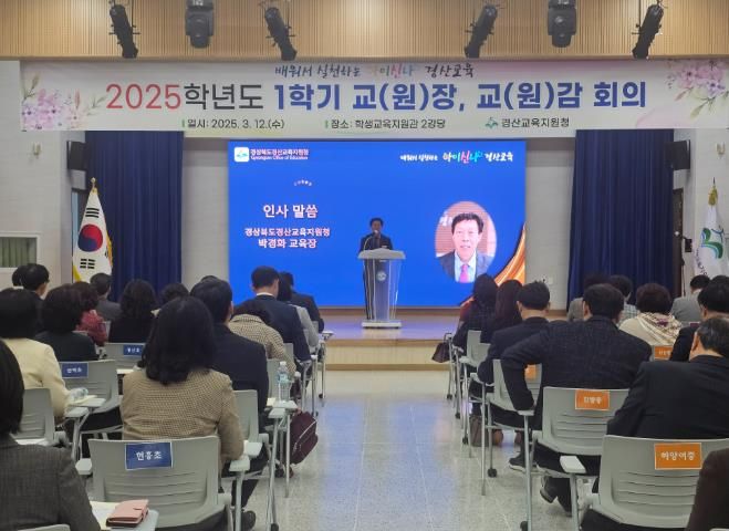 (아름다운교육신문) 경상북도경산교육지원청은 3월 12일 오전 10시 30분에 경산학생교육지원관 강당에서 관내 공립유치원 원장과 초, 중, 고, 특수학교 교장을 대상으로 신학년도 1학기 학교장 회의를 개최했다.