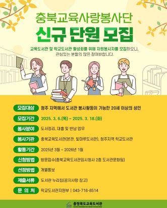 모집 기간은 오는 18일까지이며, 지원자는 교육도서관 학교지원부(청주시 흥덕구 풍산로 167, 2층 학교도서관지원부)로 직접 방문하여 지원서를 제출하여야 한다.
