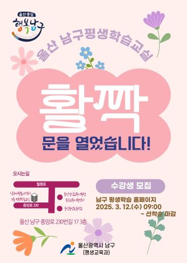 (아름다운교육신문) 울산 남구가 이달부터 자원봉사센터 내에 평생학습 전용공간인 ‘평생학습교실’을 운영하며, 주민들을 위한 다양한 평생교육 프로그램을 본격적으로 시작한다.