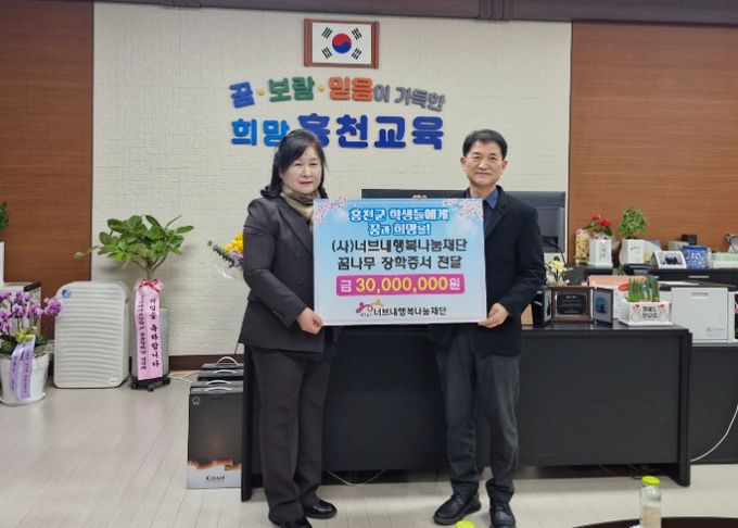 (아름다운교육신문) 홍천교육지원청은 3월 12일 18시 2층 교육장실에서 (사)너브내행복나눔재단과 함께 ‘꿈나무 장학금’ 장학증서 전달식을 가졌다.