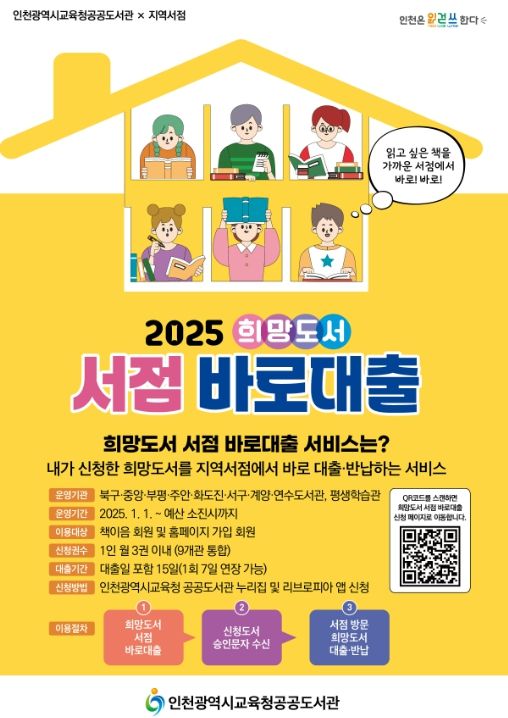 ‘희망도서 서점 바로대출’서비스는 인천광역시교육청통합공공도서관 누리집에서 신청할 수 있으며, 각 도서관 누리집과도 연동되어 있다.