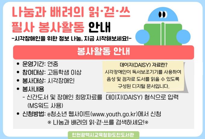 (아름다운교육신문) 인천광역시교육청화도진도서관은 시각장애인의 독서 접근성을 높이기 위해 ‘나눔과 배려의 읽걷쓰 디지털 필사 봉사활동’을 상시 모집하여 운영한다.