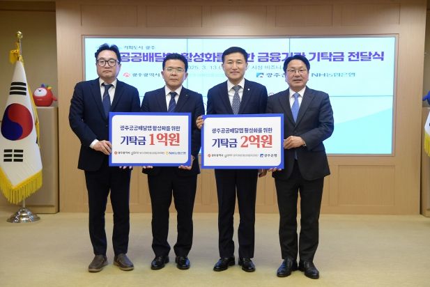 광주광역시는 13일 시청 비즈니스룸에서 ‘광주은행‧NH농협은행 광주공공배달앱 활성화를 위한 기탁금 전달식’을 열었다.