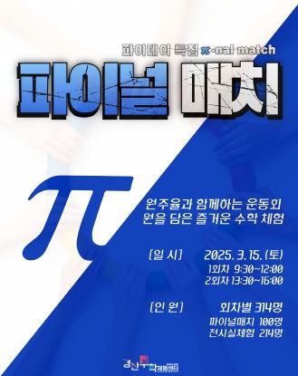 (아름다운교육신문) 경상북도교육청 경산수학체험센터는 3월 15일 파이데이 특집 프로그램 '파이널매치'를 운영한다. 파이데이를 맞이하여 개최하는 이번 행사에는 사전 예약 신청으로 630여명과 행사 운영진을 포함하여 700여명이 참가할 예정이다.