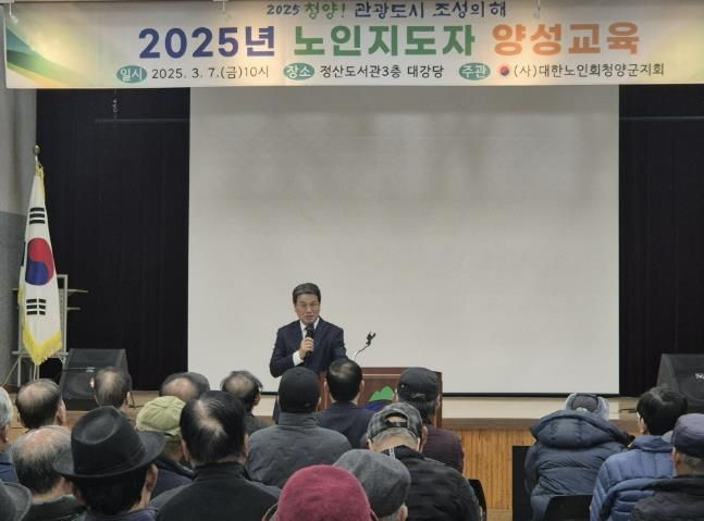 노인지도자 양성교육은 (사)대한노인회 청양군지회 주관으로 매년 실시해 오고 있으며, 올해는 311개소 경로당 회장을 대상으로 정산 지역 4개 면과 청양 지역 6개 면으로 나눠 진행했다.