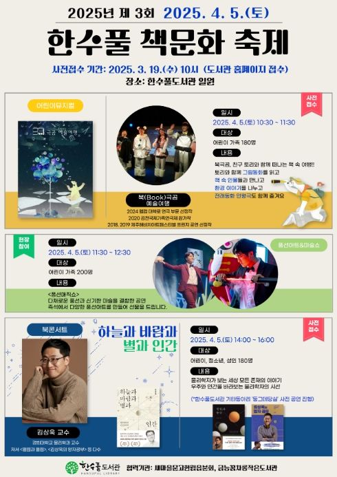 (아름다운교육신문) 제주도교육청 한수풀도서관은 4월 5일 한수풀도서관 일원에서 지역 독서 유관기관인 새마을문고한림읍분회, 금능꿈차롱작은도서관과 함께 독서문화 활성화 및 지역주민에게 다양한 문화적 경험을 제공하기 위해‘2025년 제3회 한수풀 책문화 축제’를 개최한다.