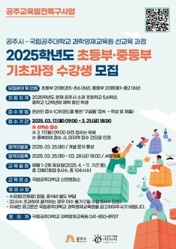 (아름다운교육신문) 공주시는 국립공주대학교 부설 과학영재교육원의 선교육 과정인 ‘2025학년 초등부‧중등부 기초과정’ 수강생을 오는 17일부터 선착순으로 모집한다고 밝혔다.
