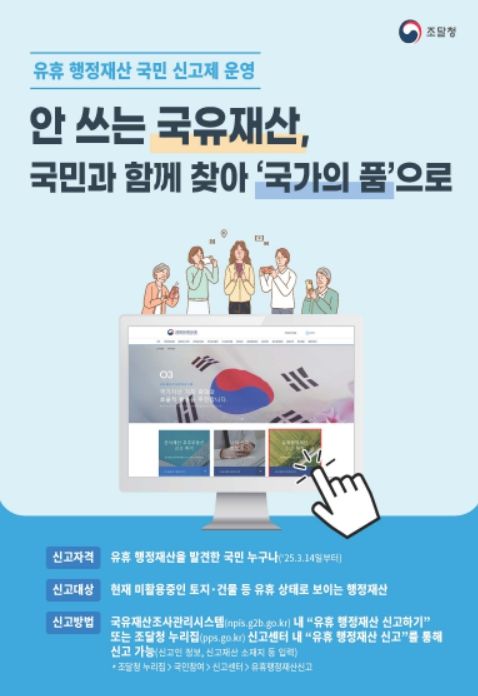 (아름다운교육신문) 조달청은 정부기관 등이 활용하지 않고 있는 토지나 건물 등 국유재산에 대하여 국민 누구나 직접 신고할 수 있는 ‘유휴 행정재산 국민 신고제’를 14일부터 도입해 운영한다고 밝혔다.