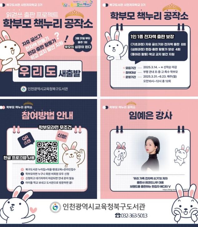 (아름다운교육신문) 인천광역시교육청북구도서관은 학부모들의 글쓰기와 출판 역량을 강화하고, 읽걷쓰 독서문화를 확산하기 위해 ‘학부모 책누리 공작소’를 운영한다.