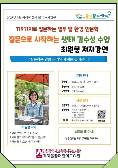 (아름다운교육신문) 인천광역시교육청서구도서관은 3월 ‘비대면 함께 읽기’ 연계 프로그램으로 최원형 작가를 초청하여 ‘질문으로 시작하는 생태 감수성 수업’ 강연을 개최한다.