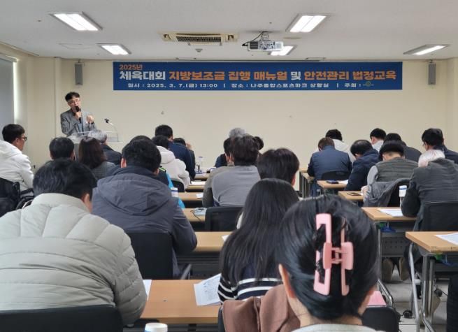 (아름다운교육신문) 전라남도 나주시는 최근 나주종합스포츠파크 종합상황실에서 체육단체 관계자 30여 명을 대상으로 지방보조금 집행 매뉴얼 및 안전관리 법정교육을 실시했다고 14일 밝혔다.