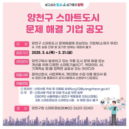 (아름다운교육신문) 양천구는 우수한 기술력과 창의적인 아이디어를 보유한 기업에게 신기술 검증 기회를 제공하고, 이를 구정에 반영해 도시경쟁력과 생활 편의성을 확보하고자 이달 21일까지 ‘스마트도시 기업 아이디어 공모’를 진행한다고 16일 밝혔다.