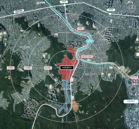 신림1구역은 경전철 신림선 서울대벤처타운역에 인접해 교통 접근성이 높고, 관악산과 별빛내린천이 있는 배산임수의 입지를 갖추고 있다.