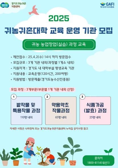 (아름다운교육신문) 경기도와 경기도농수산진흥원이 운영하는 경기도귀농귀촌지원센터가 오는 4월 2일까지 ‘2025 경기귀농귀촌대학 교육 운영’ 용역 기관 3곳을 공개 모집한다.