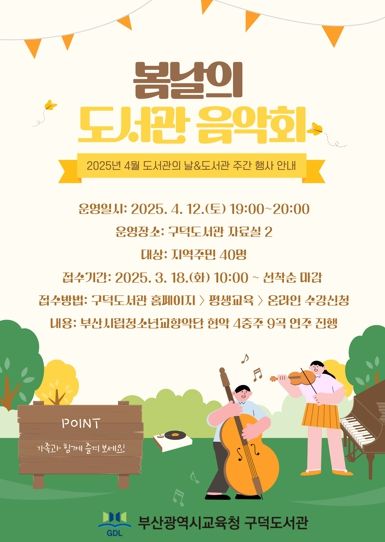 (아름다운교육신문) 부산광역시립구덕도서관은 오는 4월 12일 오후 7시부터 구덕도서관 자료실2에서 지역주민 40명을 대상으로 ‘봄날의 도서관 음악회’를 개최한다.