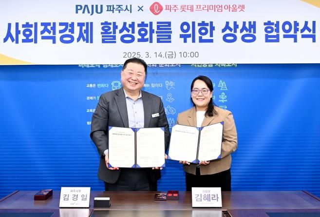 이번 협약은 파주시와 롯데프리미엄아울렛 파주점이 사회적경제 활성화에 뜻을 같이 하고 ▲사회적경제 기업의 판로 확대 ▲ 지역경제 활성화를 위한 협력 사업 등에 대한 상호 협력을 목적으로 체결됐다.