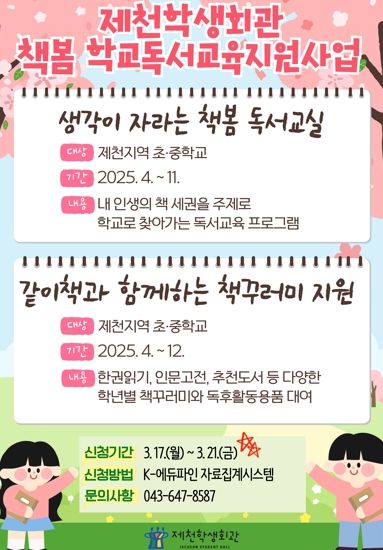 (아름다운교육신문) 제천학생회관이 오는 3월 17일부터 3월 21일까지 제천지역 초‧중학교를 대상으로 책봄 독서교육지원사업 ‘생각이 자라는 책봄 독서교실’과 ‘같이책과 함께하는 책꾸러미 지원’ 참여학교를 모집한다.
