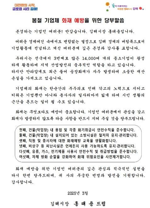 (아름다운교육신문) 김해시는 최근 잇단 공장 화재에 관내 기업체에 시장 명의 공장 화재 예방 서한문을 발송했다고 17일 밝혔다.