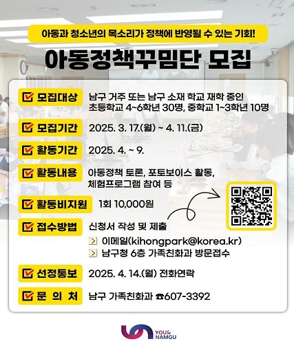 (아름다운교육신문) 부산 남구는 개청 50주년을 맞아 아동 권리 증진과 정책 참여를 목표로 하는 '아동정책꾸밈단'을 새롭게 구성하기로 하고 다음달 11일까지 모집한다.