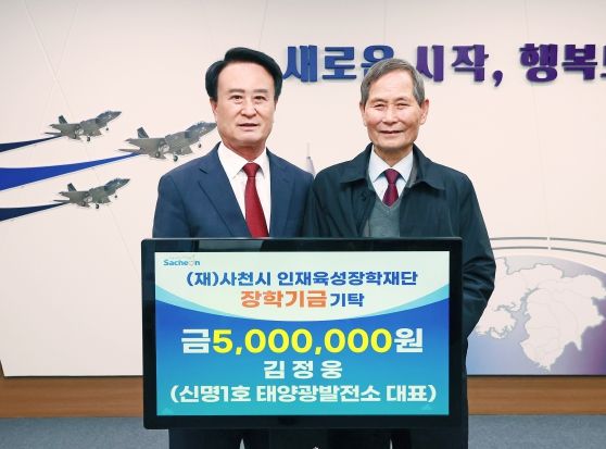 (아름다운교육신문) 사천신명1호 태양광발전소가 지난 17일 사천시청을 방문해 사천시 인재육성장학재단에 지역 인재 육성을 위한 장학금 500만 원을 전달했다.