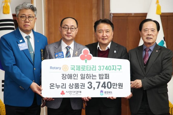 (아름다운교육신문) 국제로타리 3740지구(총재 황선태)는 3월 17일 충북도청에서 장애인복지 증진을 위한 업무협약을 체결하고, 생산적 자원봉사활동인 ‘장애인 일하는 밥퍼’ 사업 지원을 위해 충북사회복지공동모금회(회장 이민성)에 총 3,740만 원 상당의 온누리 상품권을 기탁했다.