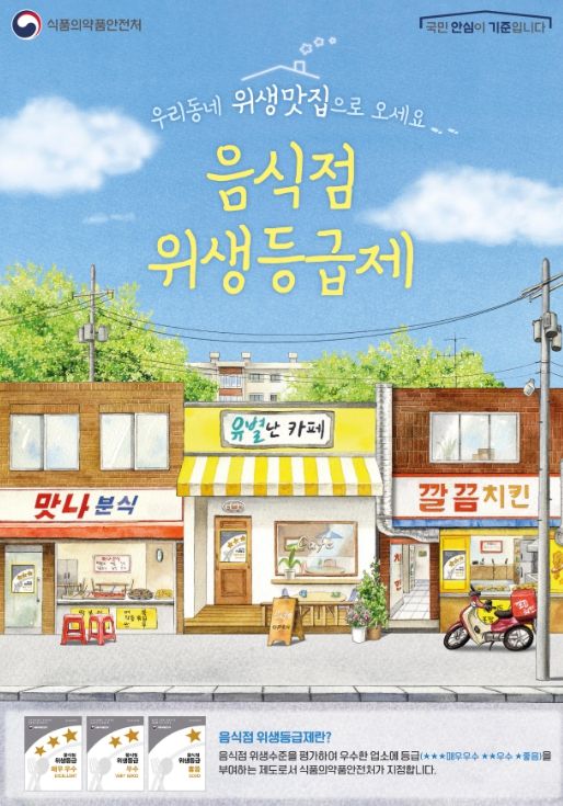 음식점 위생등급제는 식품의약품안전처에서 주관하는 제도로, 총 3개 분야 44개 항목의 평가가 진행되며, 매우 우수, 우수, 좋음으로 등급을 부여한다.