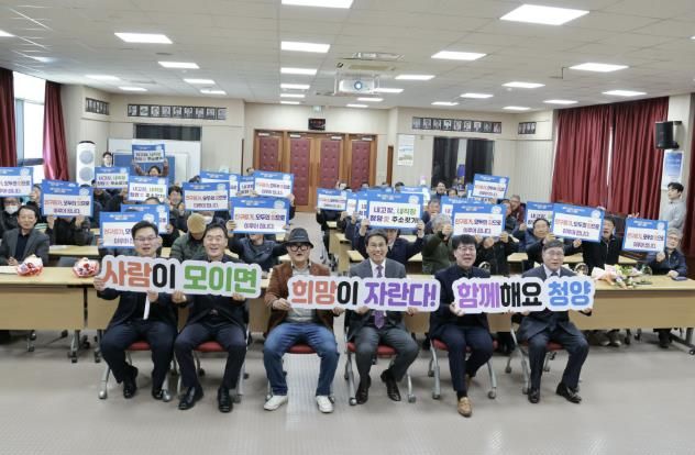 연시 총회가 끝나고 참석자들은 청양군 인구 증가 캠페인에 참여해 ‘사람이 모이면 희망이 자란다! 함께해요 청양’이라는 슬로건을 외치며 인구 증가 결의를 다졌다.