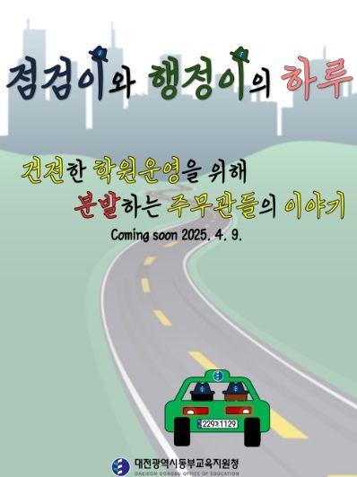 웹툰‘점검이와 행정이의 하루’는 대전동부교육지원청 평생교육체육과 학원관리팀 소속 점검이(지도,점검담당 주무관), 행정이(인허가담당 주무관)들이 건전한 학원운영을 위한 업무처리 절차 내용을 등을 담은 웹툰이다.
