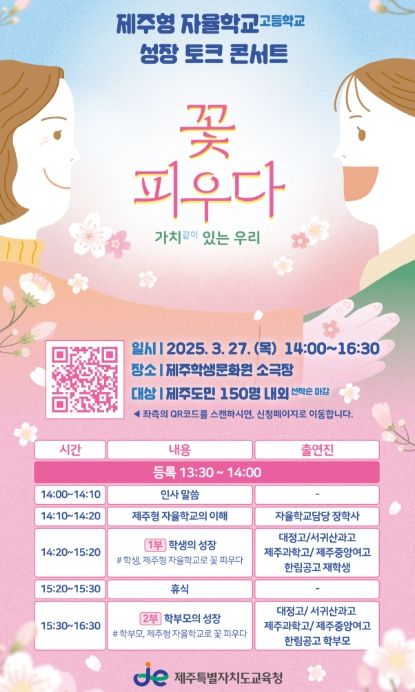 (아름다운교육신문) 제주특별자치도교육청은 오는 27일 교육공동체의 제주형 자율학교 이해도를 높이기 위한 ‘제주형 자율학교(고등학교) 성장 토크 콘서트’를 제주학생문화원 소극장에서 개최한다.